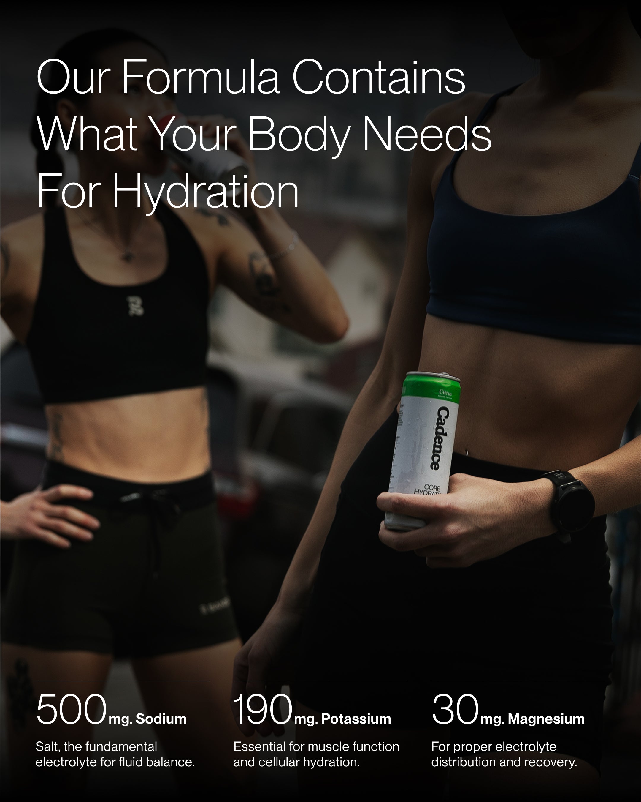 The Core Hydration Drink contains three key electrolytes: Sodium, Potassium, and Magnesium, formulated to support hydration and electrolyte balance in the body.