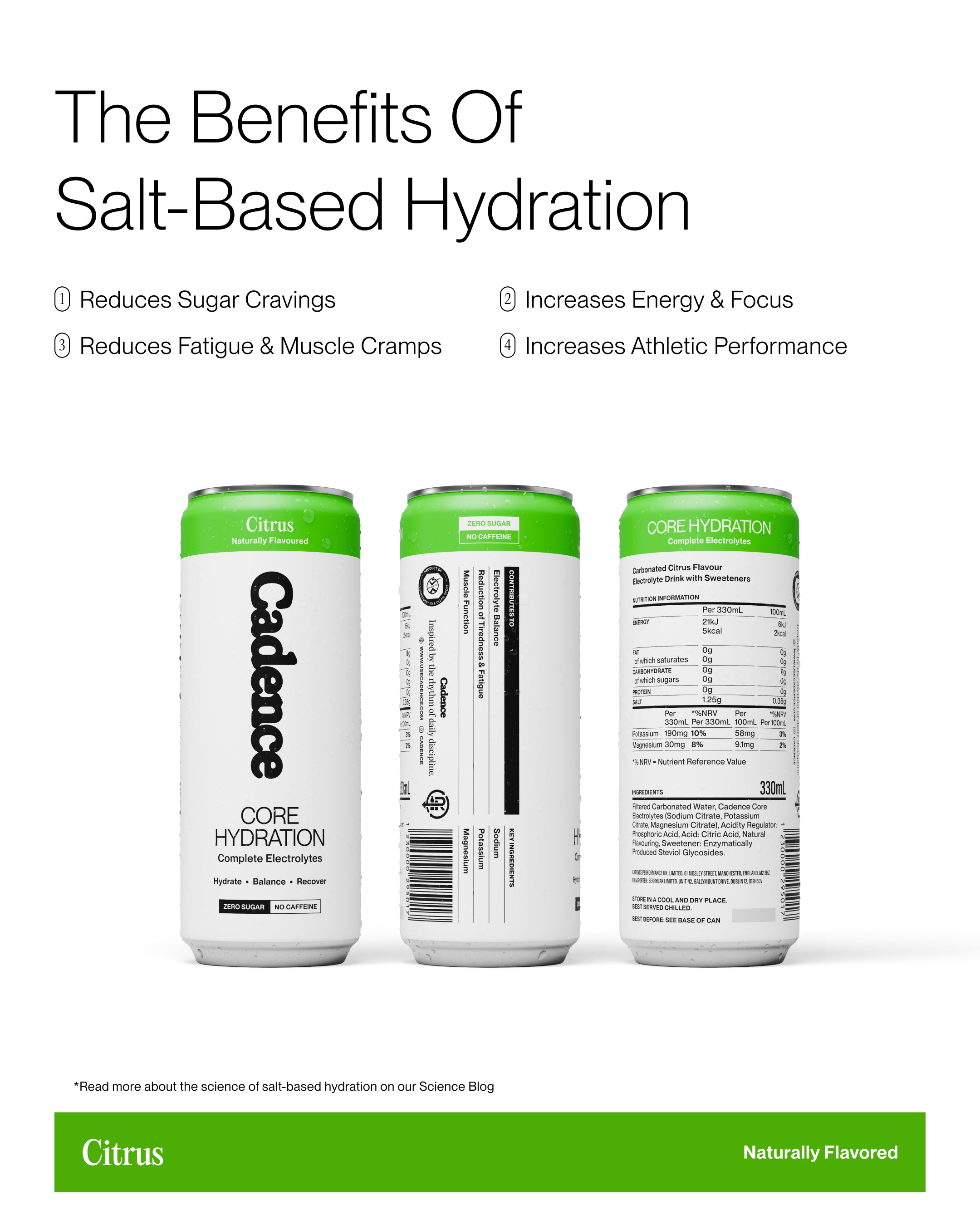 Electrolyte consumption is highly dependent on the individual. It is important to note that Cadence is meant to supplement your electrolyte intake; it should not be your sole source of electrolytes. We recommend that you acquire most of your electrolytes from whole food sources, however you can supplement with 2 -3 cans per day, depending on your activity level. For any specific guidance on daily salt intake, you should consult your doctor.